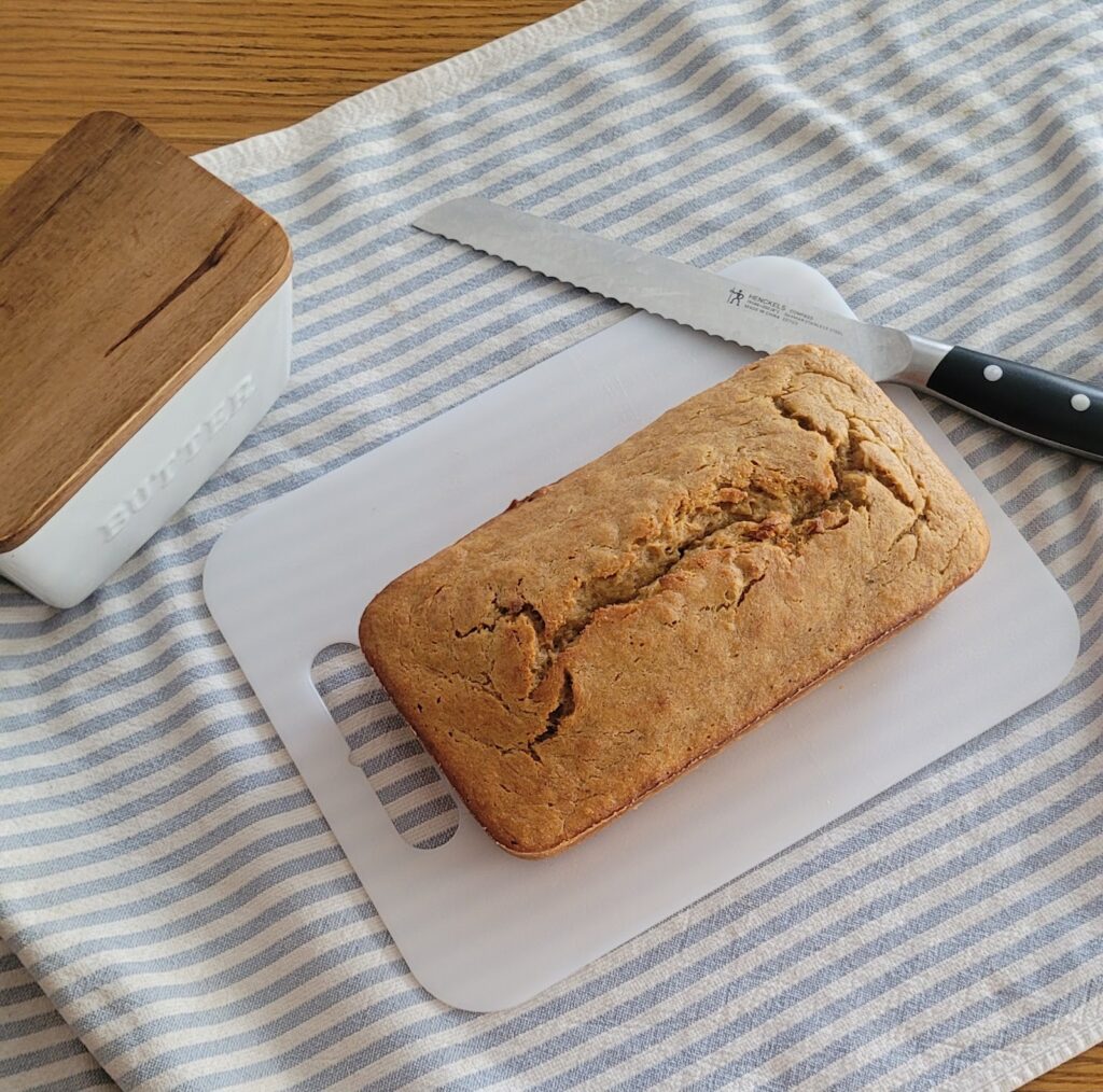 This recipe makes 1 loaf of banana bread (5×9 loaf pan). Prep Time: 10 minutes. Bake time: 1 hour 10 minutes. Total time: 1 hour 20 minutes.
